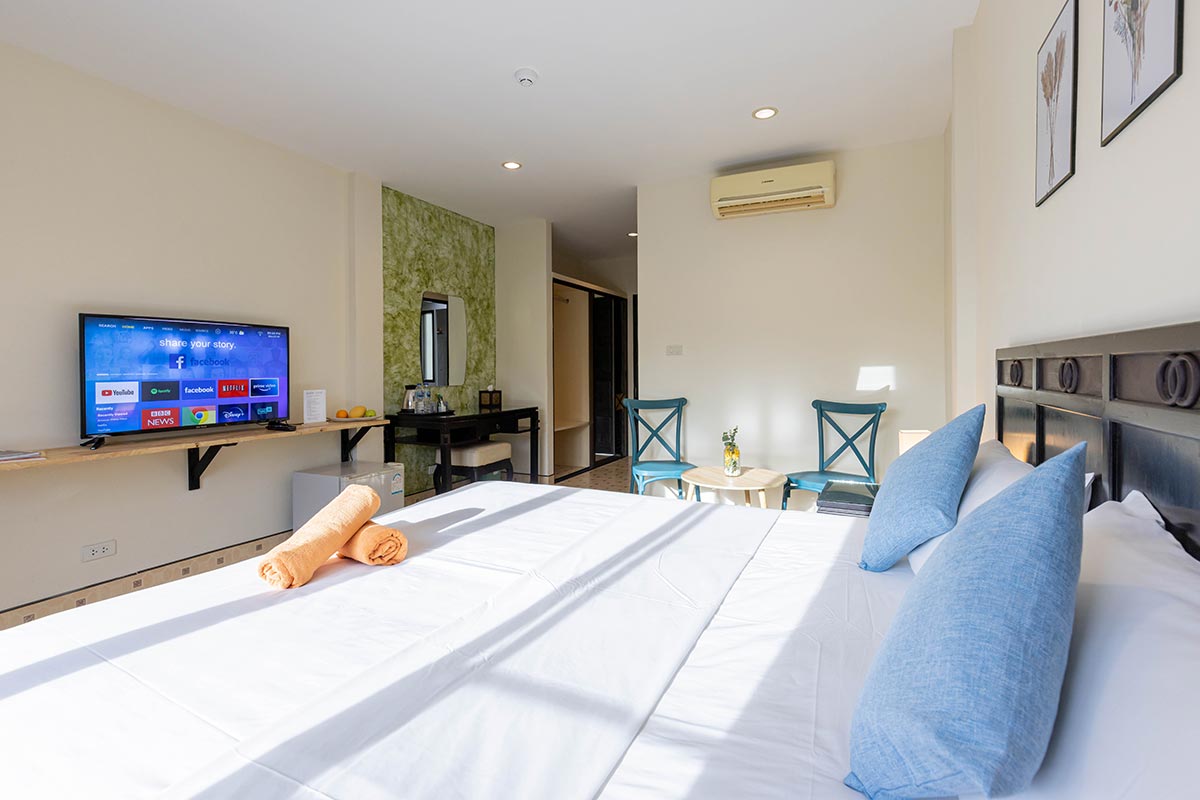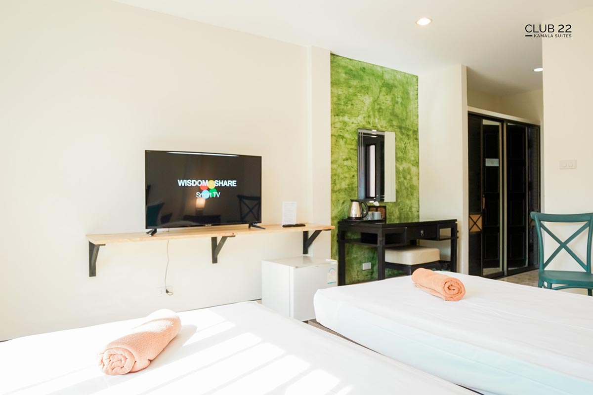 The hotel features spacious and clean Superior and Family rooms with air conditioning, a working desk, a smart 43" TV, a private bathroom, and a balcony. Amenities such as a water kettle, drinking water, shampoo, shower gel and towels are provided among others. Popular points of interest near Club22 Kamala Suites include Café del Mar Beach Club, Kamala beach, Magic Carnival Show, Patong Beach, and many other beaches.